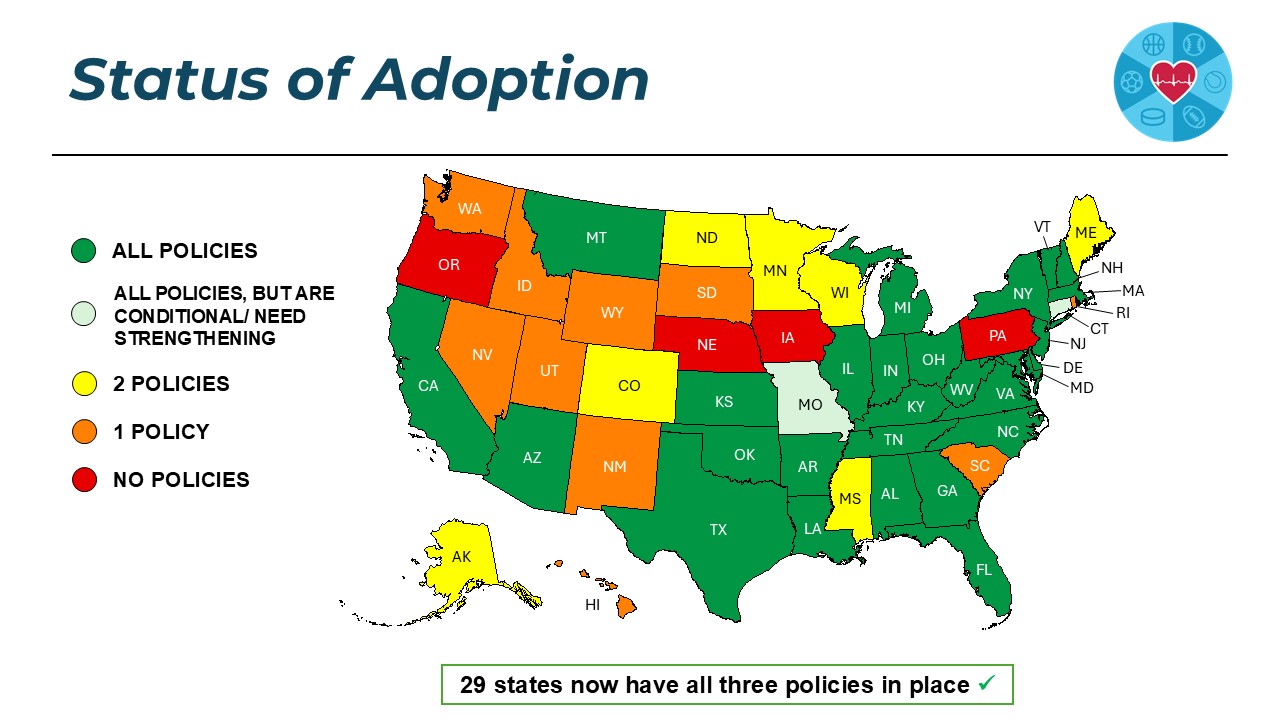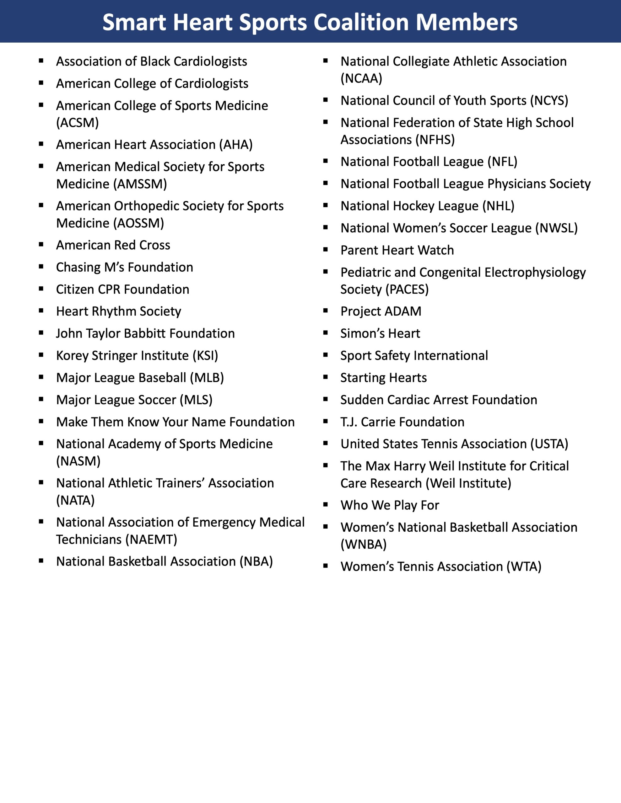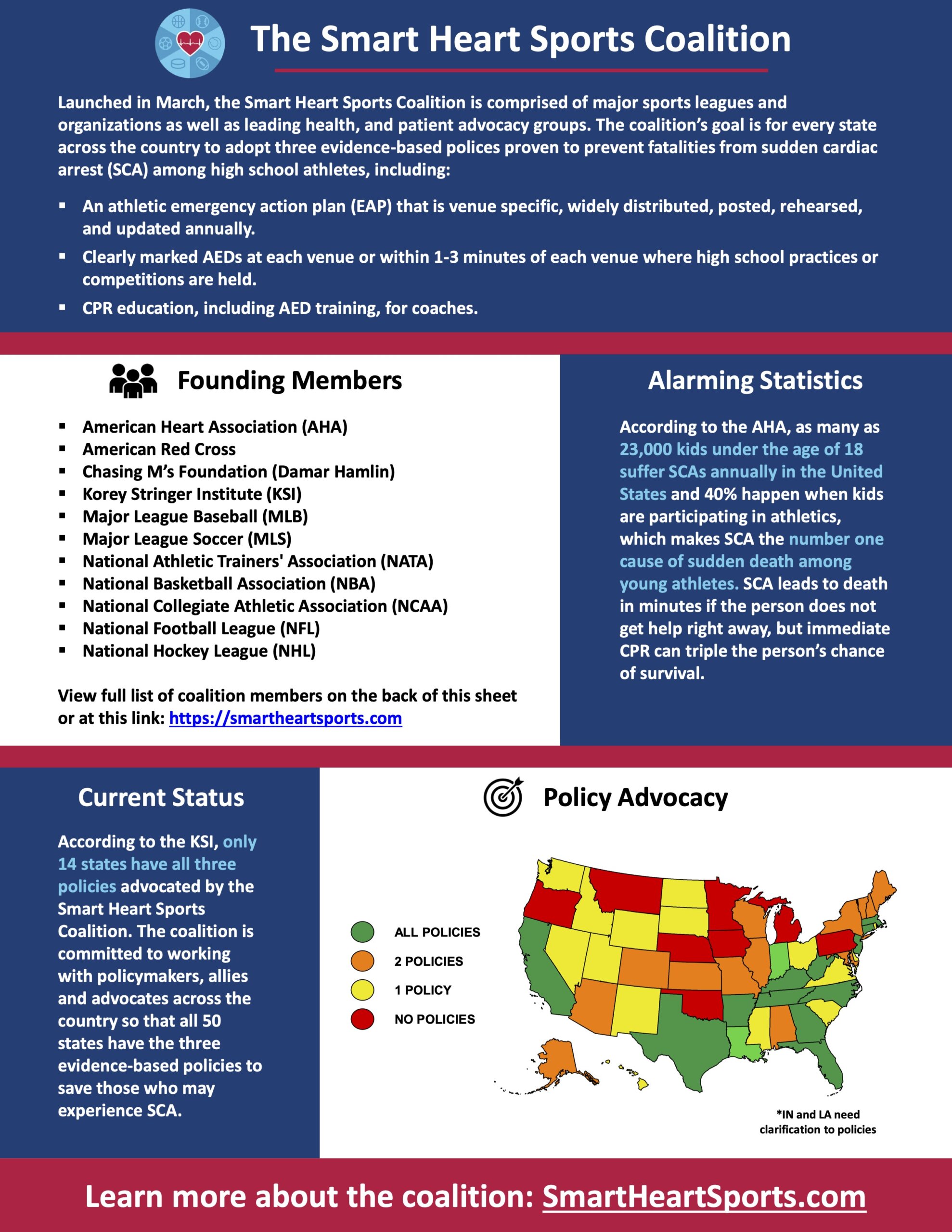 On March 27, 2023, the National Football League, along with other major sports organizations and leading patient and health advocacy groups, announced the formation of The Smart Heart Sports Coalition, to advocate for all 50 states to adopt evidence-based policies that will help prevent fatal outcomes from Sudden Cardiac Arrest (SCA) among high school students.