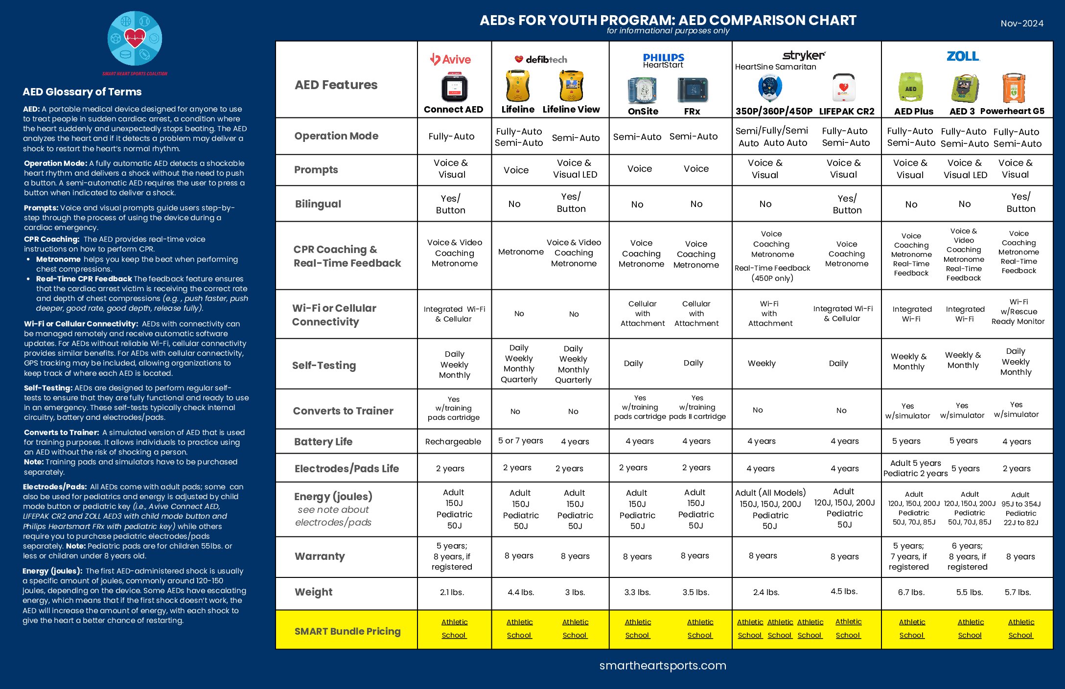 Click on the “AEDS For Youth” button to view a side-by-side comparison chart of AEDs, and to find out about purchasing an “AED school bundle” or an “AED athletic bundle” that fits your specific needs.